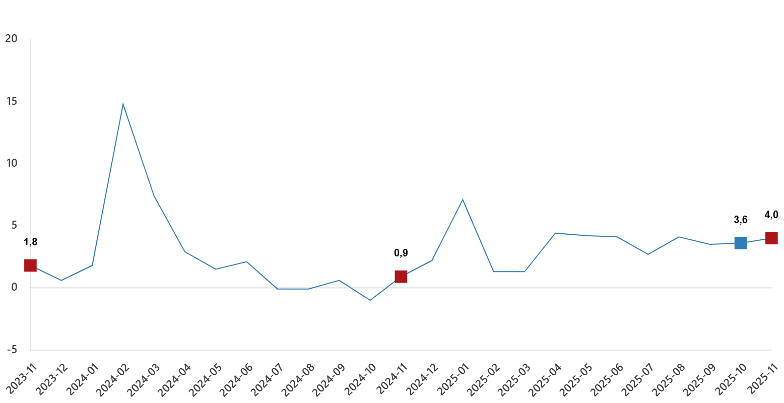 Hizmet üretim endeksi (2021=100) 2025 yılı Kasım ayında bir evvelki yılın birebir ayına nazaran %4,0 arttı. Tıpkı ayda ulaştırma ve depolama hizmetleri %1,6 arttı, konaklama ve yiyecek hizmetleri %7,2 arttı, bilgi ve irtibat hizmetleri %8,7 arttı, gayrimenkul hizmetleri %3,0 arttı, mesleksel, bilimsel ve teknik hizmetler %1,7 arttı, idari ve dayanak hizmetleri ise %5,1 arttı.